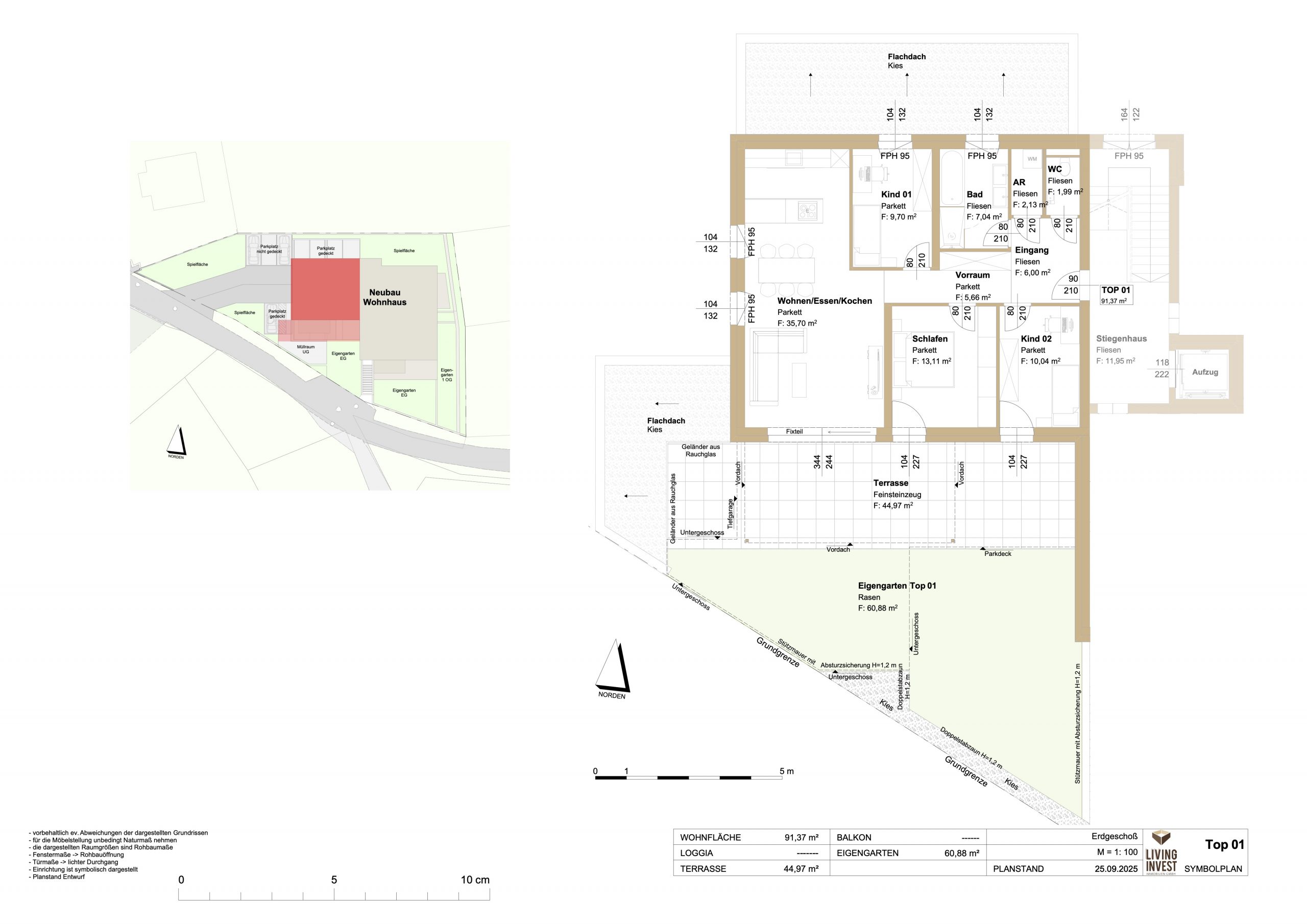 TOP 1 ist eine großzügige 4-Zimmer-Gartenwohnung im Erdgeschoss mit 91,37 m² Wohnfläche. Der offene Wohn-/Ess- und Küchenbereich bildet das Herzstück der Wohnung und öffnet sich direkt zur 44,97 m² großen Terrasse sowie in den privaten Eigengarten (60,66 m²). So entsteht ein heller Lebensmittelpunkt mit direktem Bezug ins Grüne – ideal zum Entspannen oder für gemeinsame Stunden im Freien.
