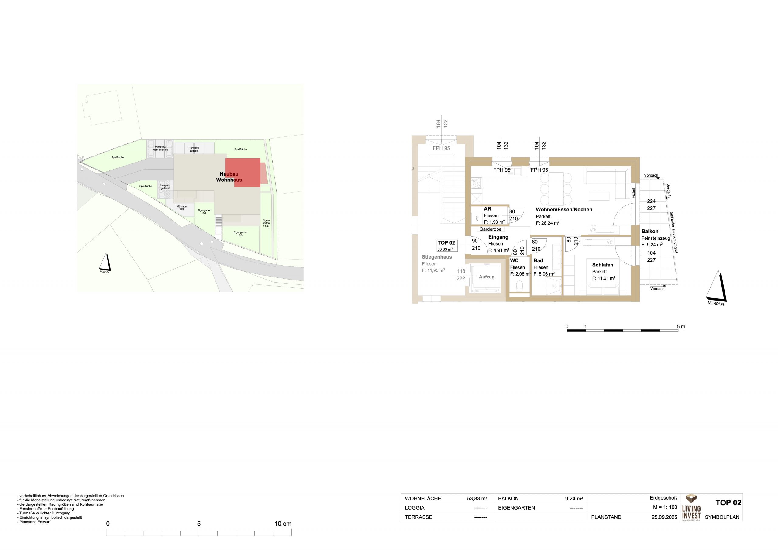 TOP 2 ist eine charmante 2-Zimmer-Wohnung im Erdgeschoss mit 53,83 m² Wohnfläche. Der einladende Wohn-/Ess- und Kochbereich öffnet sich direkt zum 9,24 m² großen Balkon, der zusätzlichen Freiraum bietet und den Blick ins Grüne ermöglicht. Das Schlafzimmer ist kompakt und zugleich komfortabel gestaltet – ein idealer Rückzugsort für erholsame Stunden.