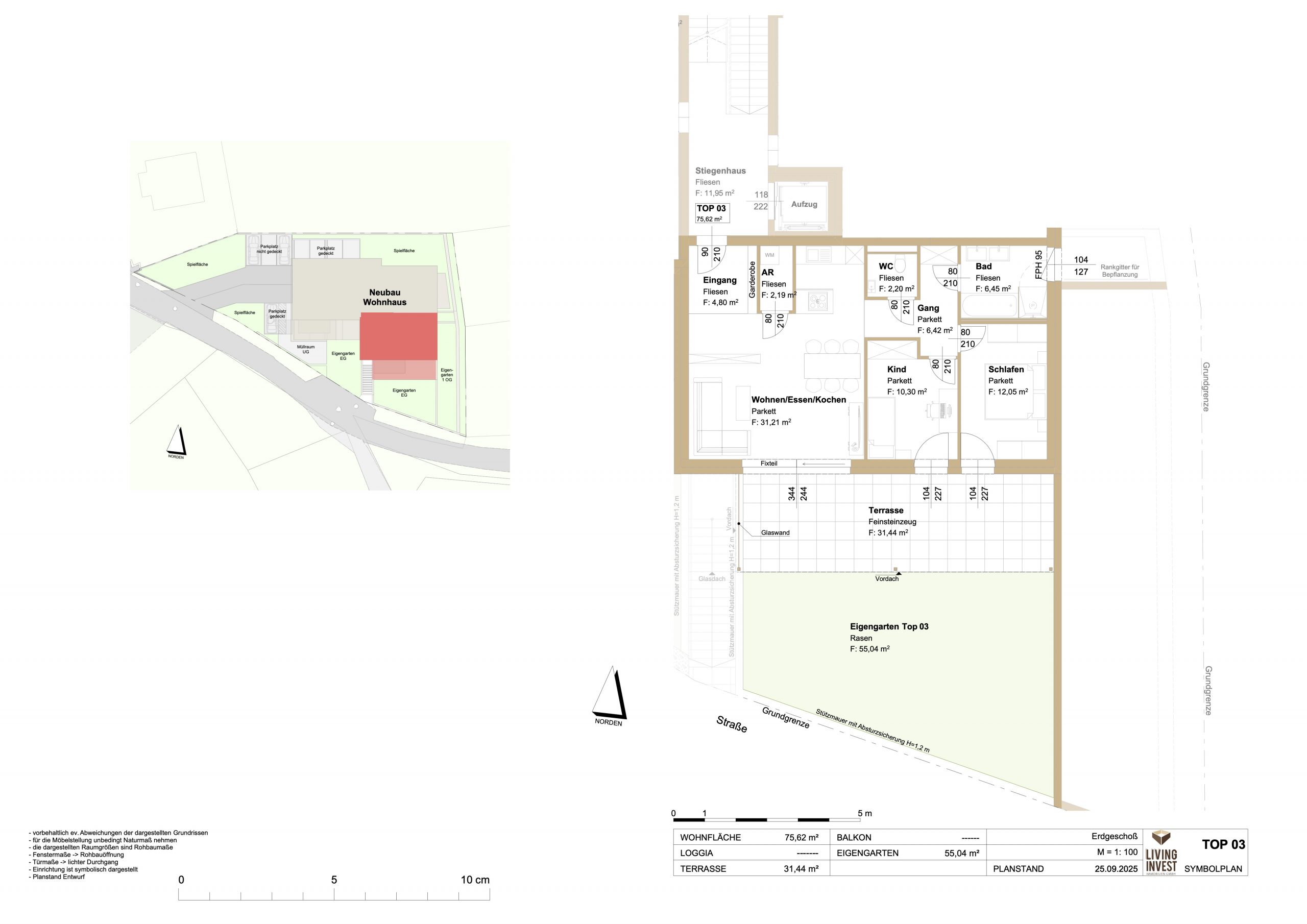 TOP 3 ist eine sonnig ausgerichtete 3-Zimmer-Gartenwohnung im Erdgeschoss mit 75,62 m² Wohnfläche. Der großzügige Wohn-/Ess- und Küchenbereich öffnet sich zur 31,44 m² großen, vollständig überdachten Terrasse und in den 55,04 m² großen Eigengarten – perfekt für entspannte Stunden im Freien oder geselliges Beisammensein. Dank Südorientierung profitieren Wohnräume und Außenflächen von viel Tageslicht.