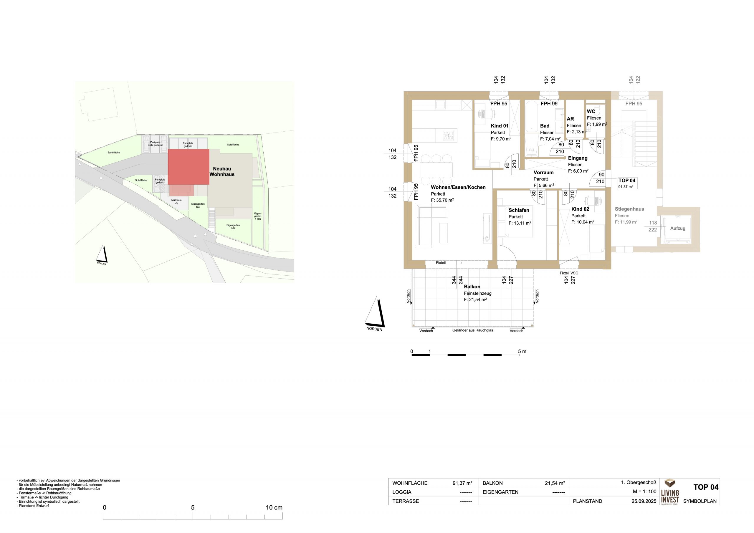 TOP 4 ist eine großzügige 4-Zimmer-Wohnung im 1. Obergeschoss mit 91,70 m² Wohnfläche. Mittelpunkt ist der weitläufige Wohn-/Ess- und Küchenbereich, der sich nach Süden öffnet und direkten Zugang zum 21,54 m² großen, vollständig überdachten Balkon bietet – ein sonniger Platz für entspannte Stunden im Freien.