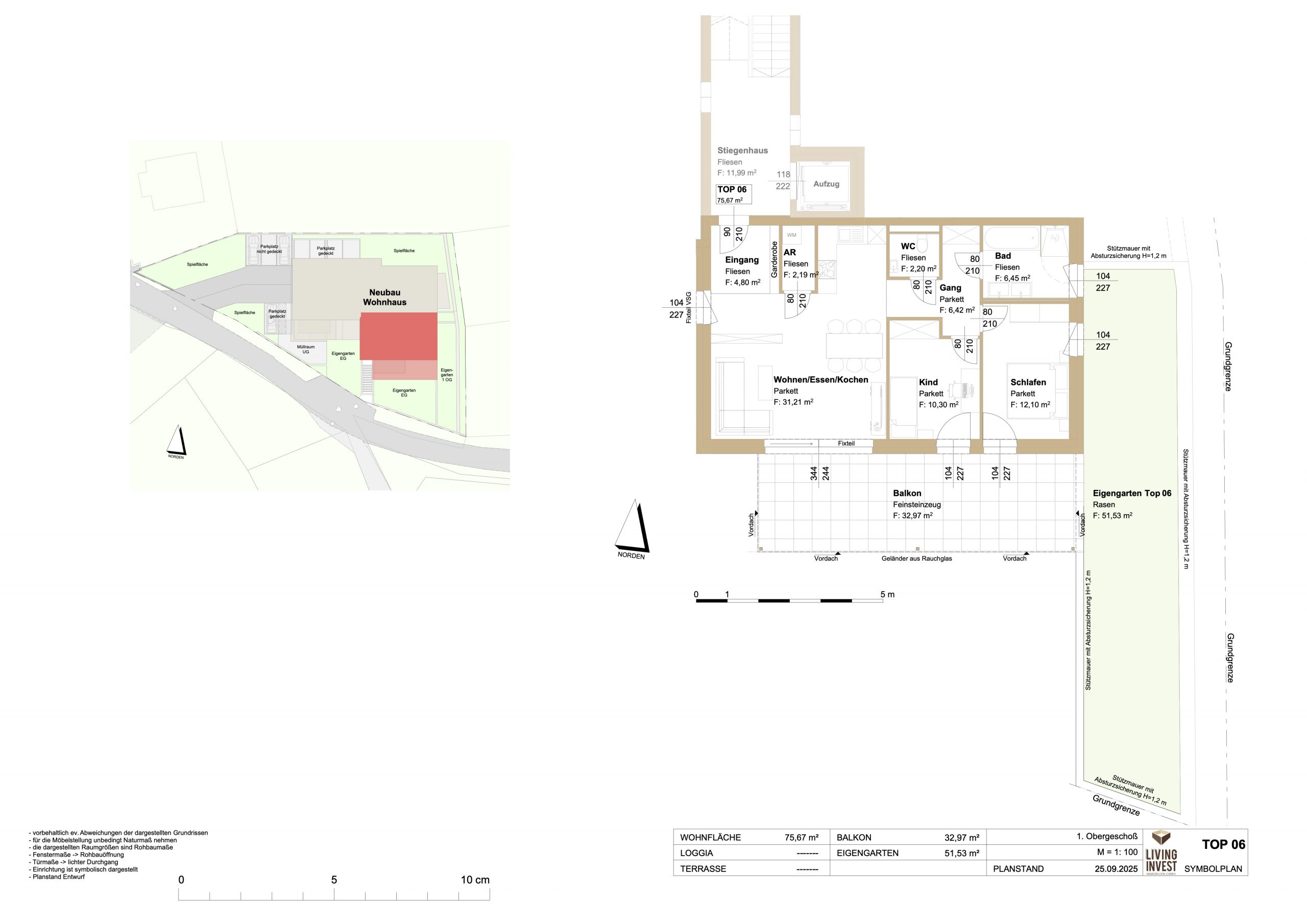 TOP 6 ist eine exklusive 3-Zimmer-Wohnung im 1. Obergeschoss mit 75,67 m² Wohnfläche. Das Besondere: Sie genießen sowohl einen großzügigen, komplett überdachten Balkon mit 32,97 m² als auch einen privaten Eigengarten mit 51,53 m². Damit vereint diese Wohnung das Beste aus beiden Welten – wettergeschütztes Outdoor-Living und die Möglichkeit, Grünfläche individuell zu gestalten.
